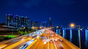 Beautyful of traffic in Seoul at night and cityscape, South Korea with motion blur.